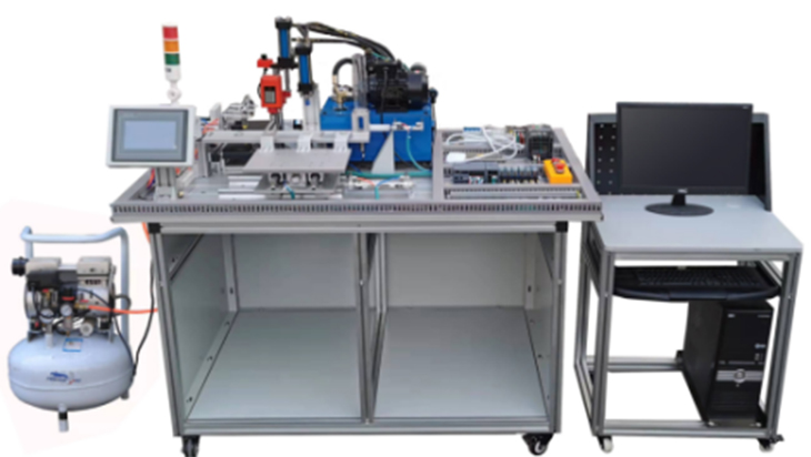 機(jī)電液氣一體化綜合實訓(xùn)考核裝置的實訓(xùn)工作臺為鋁合金型材組合而成,臺面上安裝有上料、傳送、沖壓加工、夾緊、鉆孔加工、分揀、入料槽等,并配有液壓系統(tǒng)、氣壓系統(tǒng)、變頻器及繼電器控制、PLC等