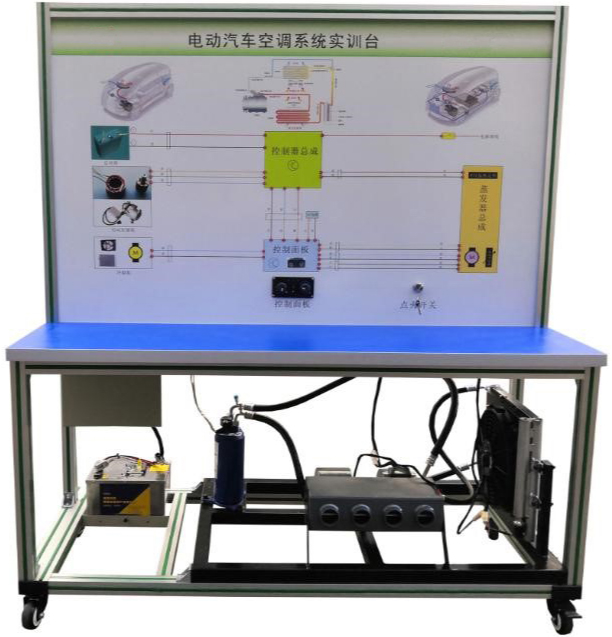 點火開關、電動汽車空調壓縮機、膨脹閥總成、干燥器總成、鼓風機總成、冷凝器、冷卻電子風扇、電動空調壓縮機控制器總成、空調蒸發(fā)箱總成、充電器與充電接口、充電插線、DC-DC轉換器、鋰電池組、空調操作面板、高低壓空調壓力表、采暖模塊總成、電源總開關、急停開關、直流接觸器、輔助蓄電池(12V45AH)、一體化全鋁合金型材搭建的移動臺架(1500×700×1700mm 帶自鎖腳輪裝置,帶安裝檢測端子的原理面板,面板1448×940mm)、故障模擬與排除裝置、設備操作說明書。