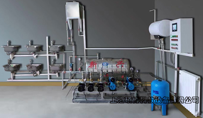 1、生活給水系統(tǒng):主要有給水箱、給水泵、給水管道、壓力變送器、脈沖水表、水龍頭和淋浴頭等組成。管路采用不銹鋼管進(jìn)行設(shè)計(jì),可進(jìn)行不銹鋼管的切割、安裝和通水試驗(yàn)操作,通過控制系統(tǒng)可實(shí)現(xiàn)生活給水系統(tǒng)的變頻恒壓供水功能,實(shí)現(xiàn)單泵變頻控制或雙泵切換控制等功能;通過脈沖式水表可以完成用水量的計(jì)量。