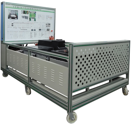 (比亞迪e5 EV300純電動汽車) 鋰動力電池組、電池管理系統(tǒng)BMS、BMS顯示屏(7寸觸摸屏)、維修開關、輔助蓄電池(12V45AH)、高壓配電箱、漏電傳感器、車載充電機、國標充電插座與充電槍、直流接觸器(包含充電繼電器、總正繼電器、總負繼電器、預充繼電器)、急停開關與電源總開關、一體化全鋁合金型材搭建的移動臺架(1500×700×1700mm ,帶自鎖腳輪裝置,帶安裝檢測端子的原理面板1448×940mm)、故障考核系統(tǒng)、設備操作說明書。