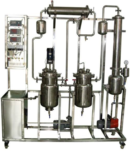 中藥提取實驗裝置由提取罐、蒸發(fā)器、攪拌電機、列管式加熱器、冷凝器、油分器、收油器、藥液泵、貯液罐、過濾器、真空泵、調(diào)速器、數(shù)顯溫度儀、不銹鋼框架、控制屏等組成。提取罐、蒸發(fā)器配導(dǎo)熱油加熱系統(tǒng),提取罐、蒸發(fā)器頂部蒸汽出口均設(shè)置了除沫器。